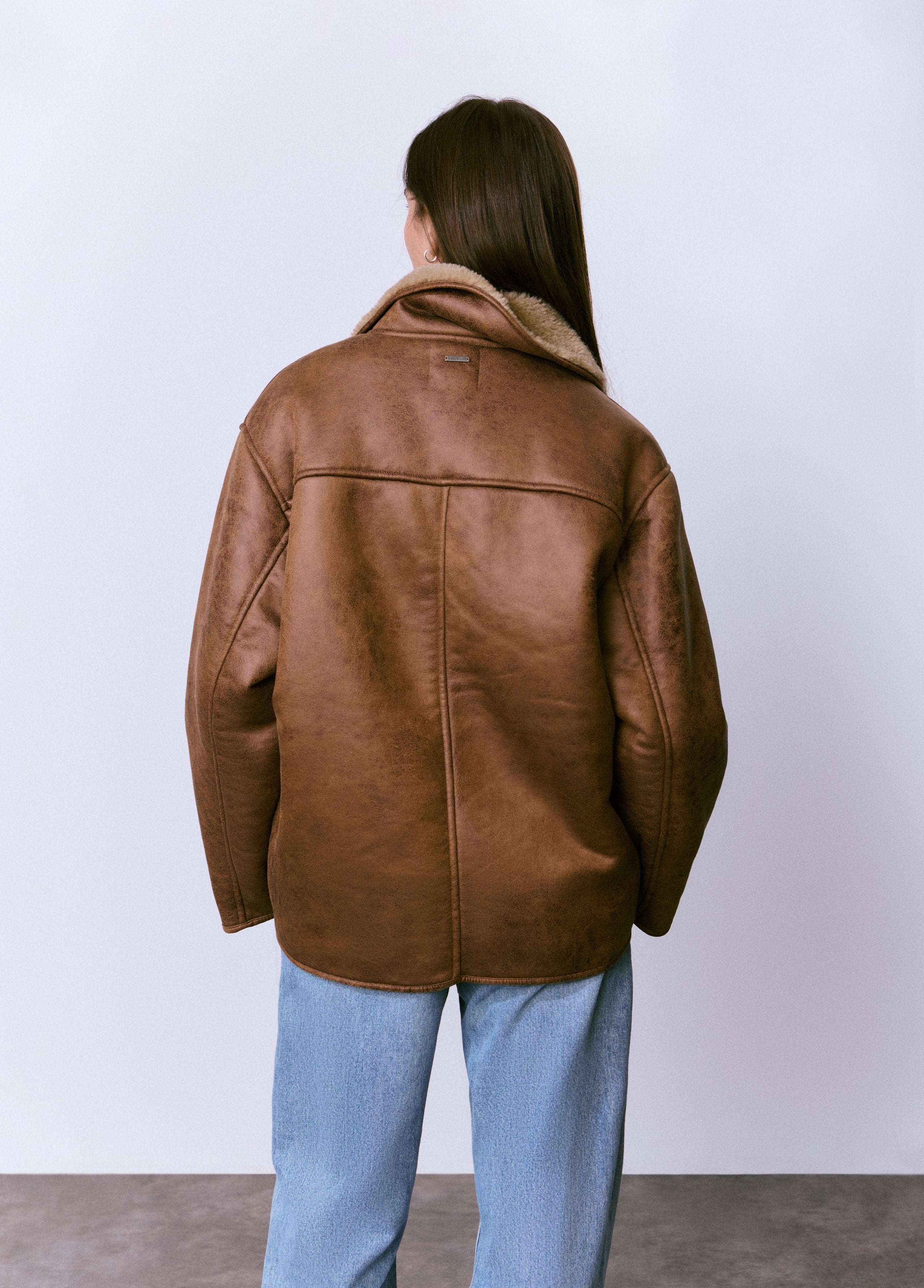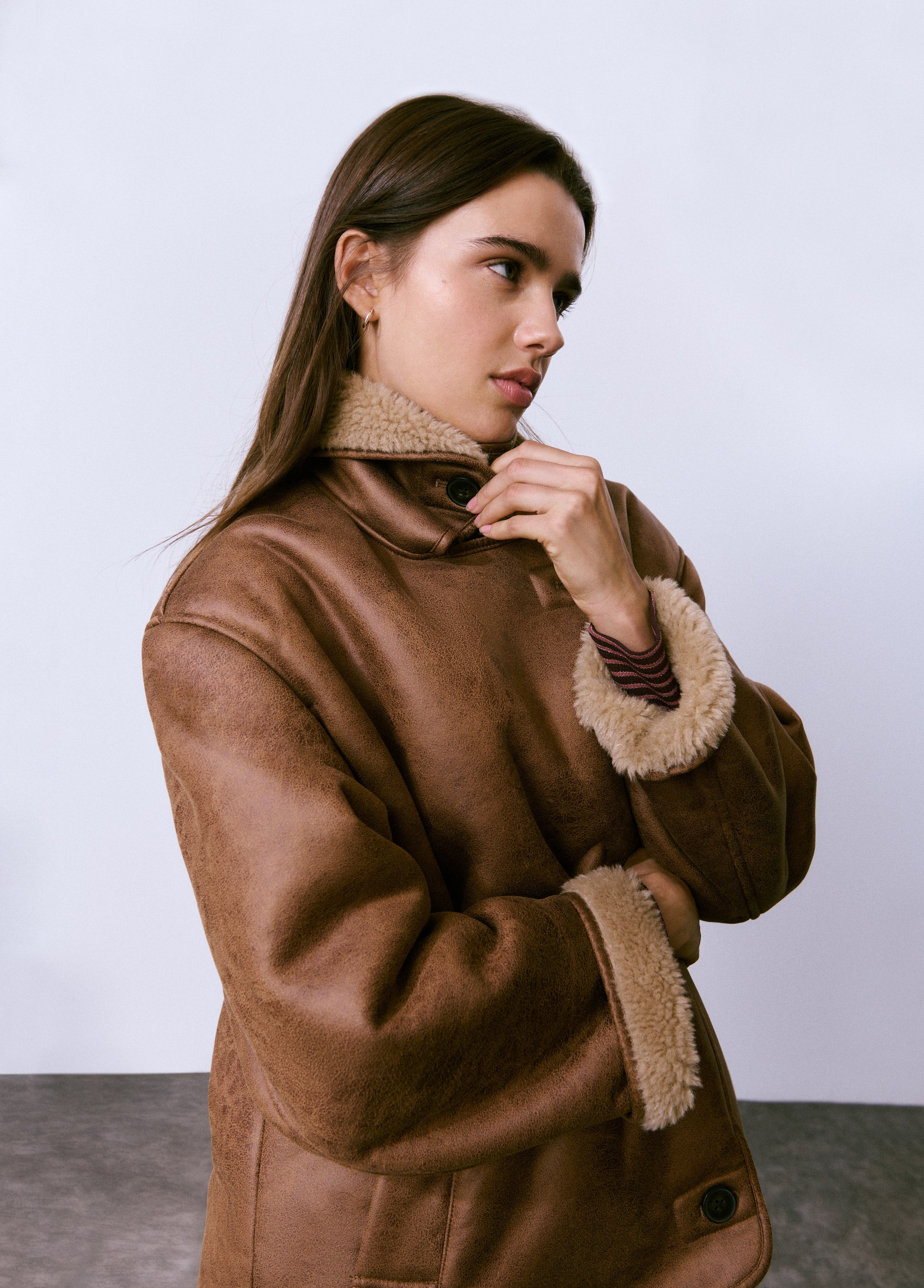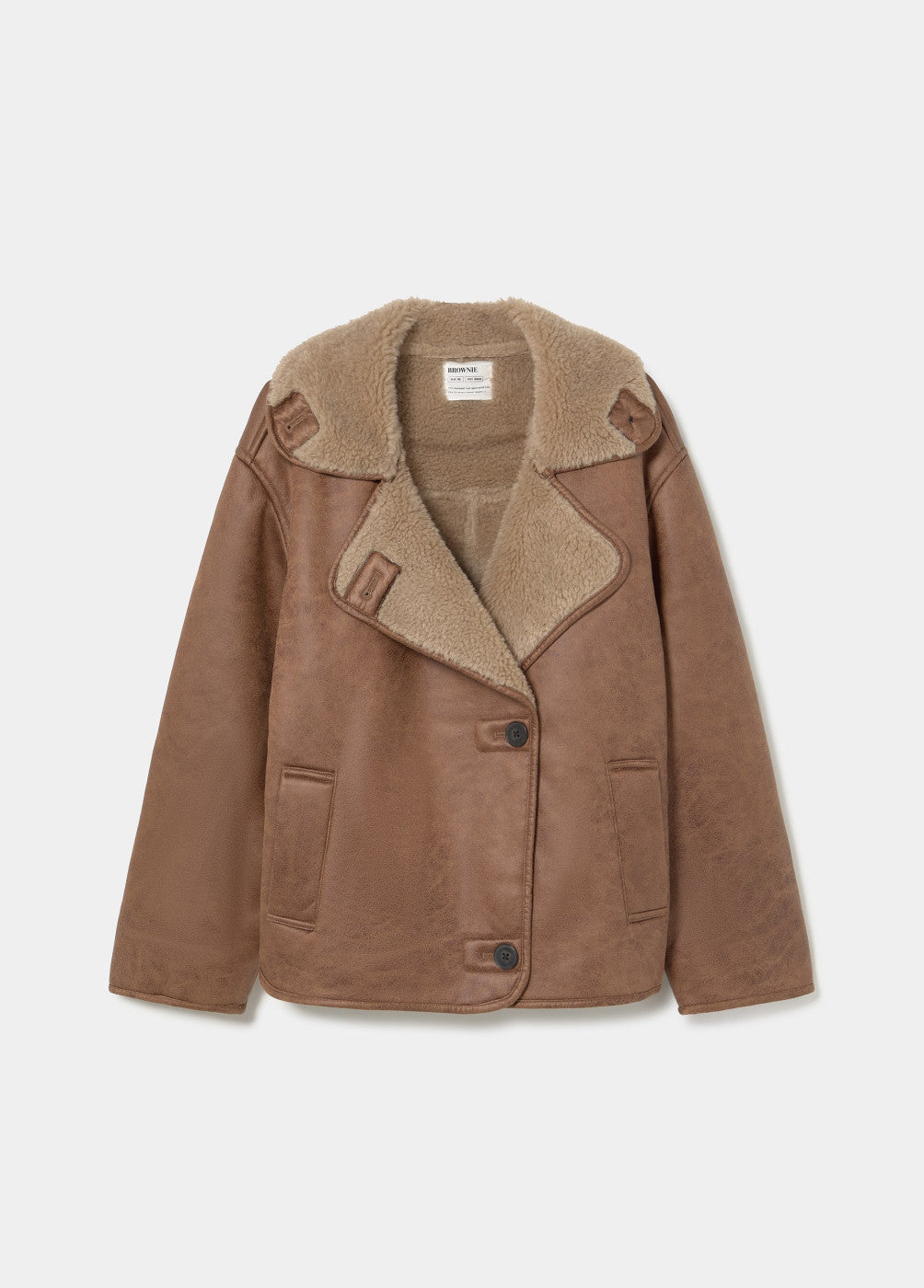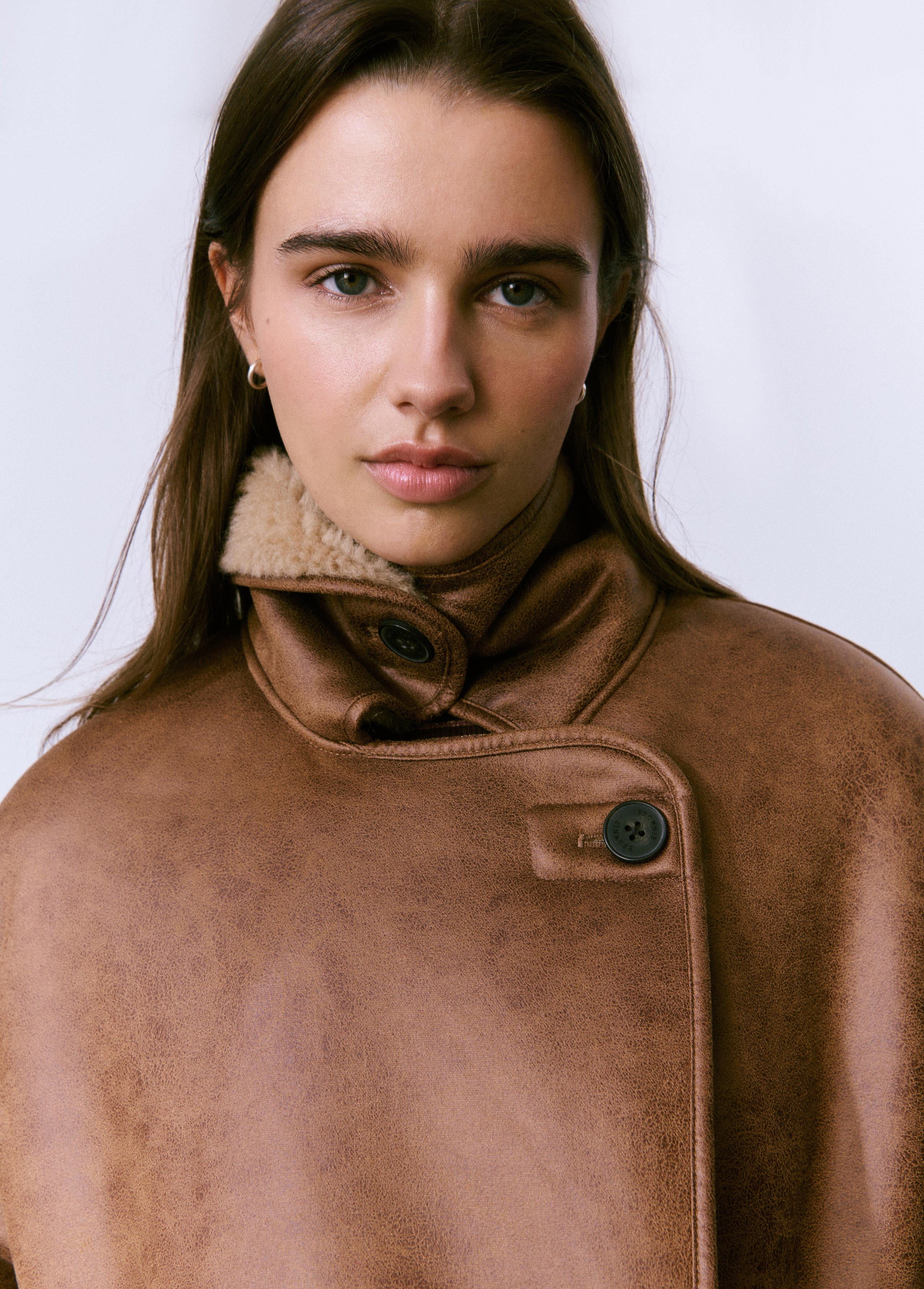 Abrigo doblefaz efecto piel con cierre de botones en el centro y forro tipo borrego.