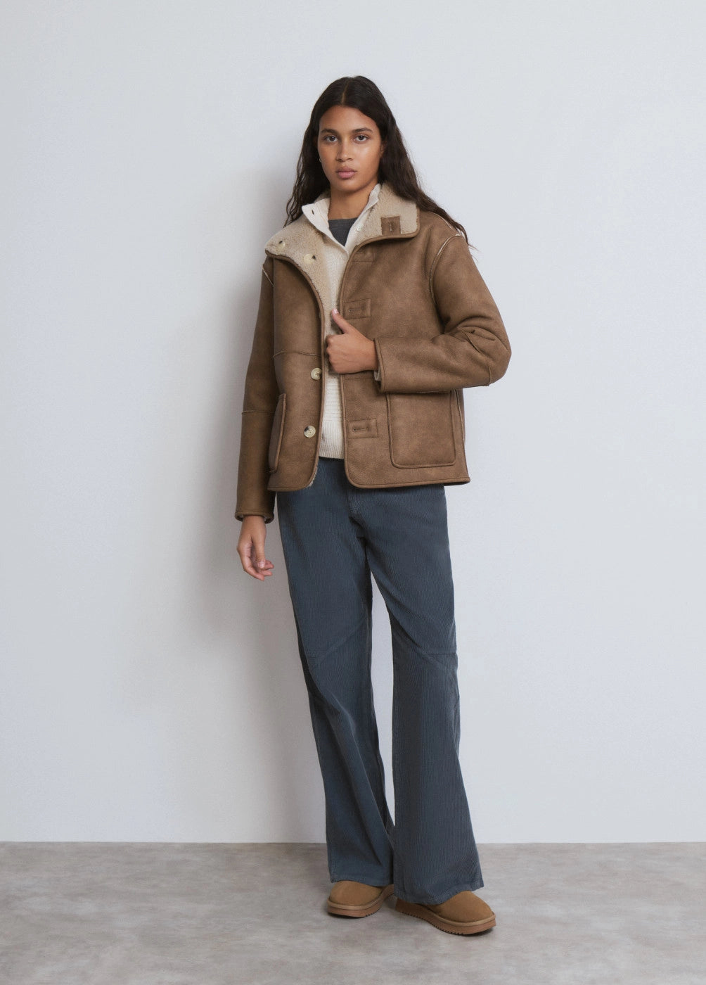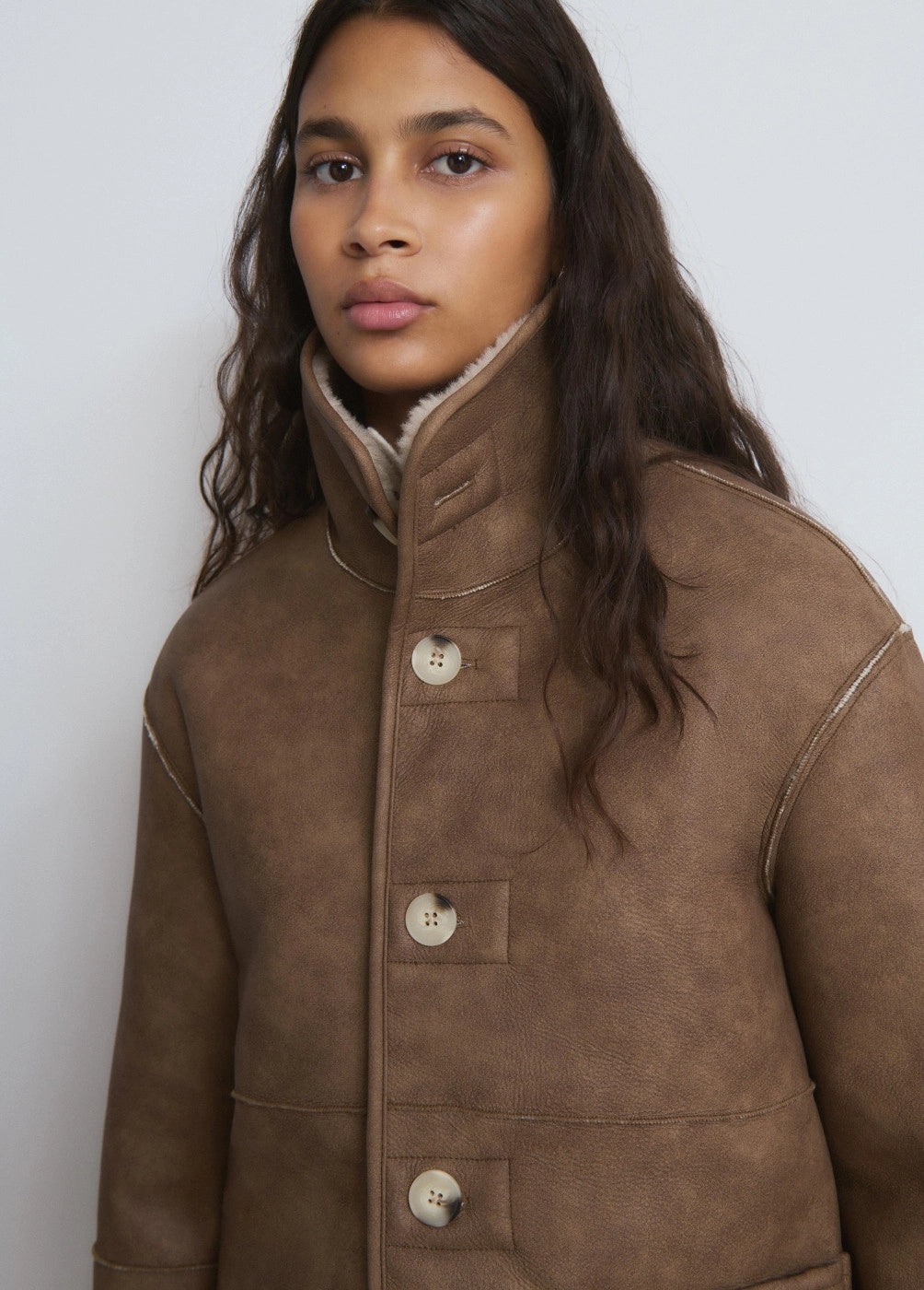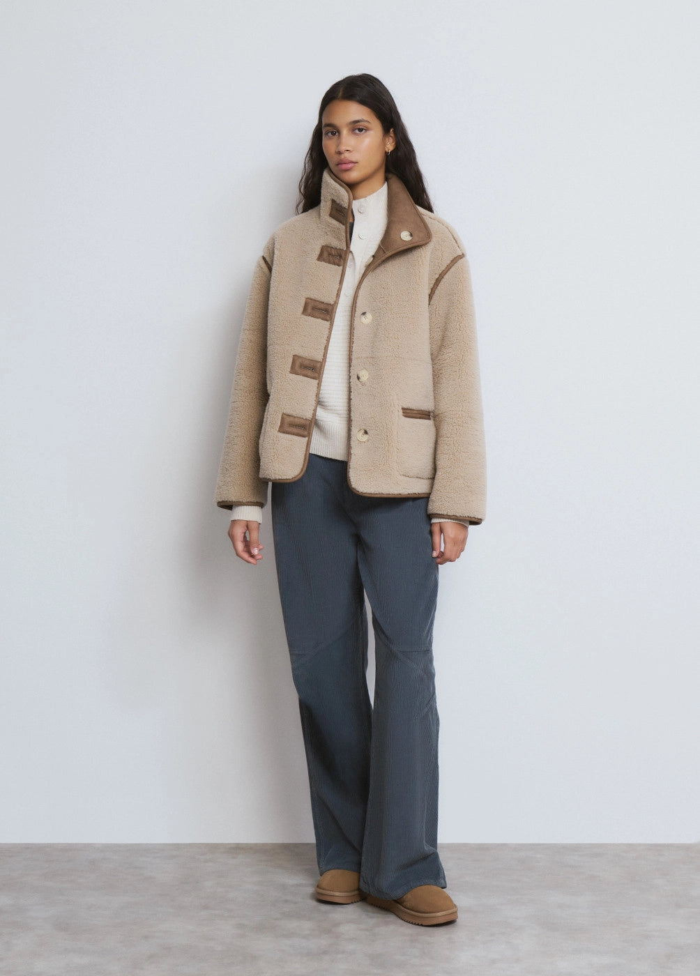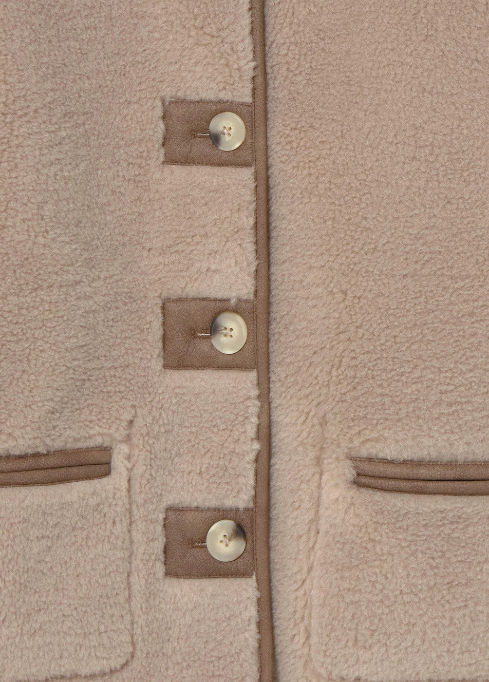Abrigo doblefaz reversible con efecto borrego, bolsillos delanteros y cierre mediante botón.