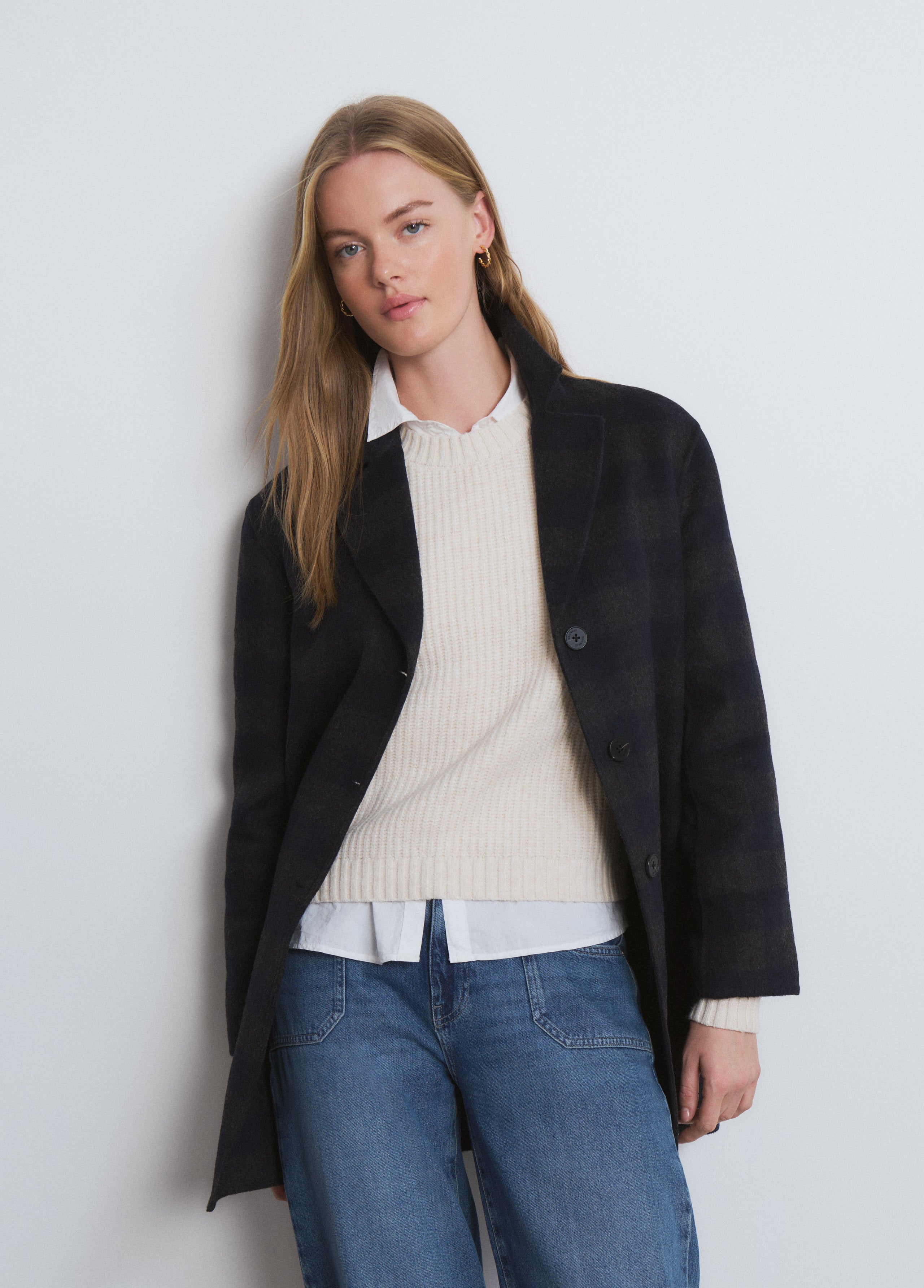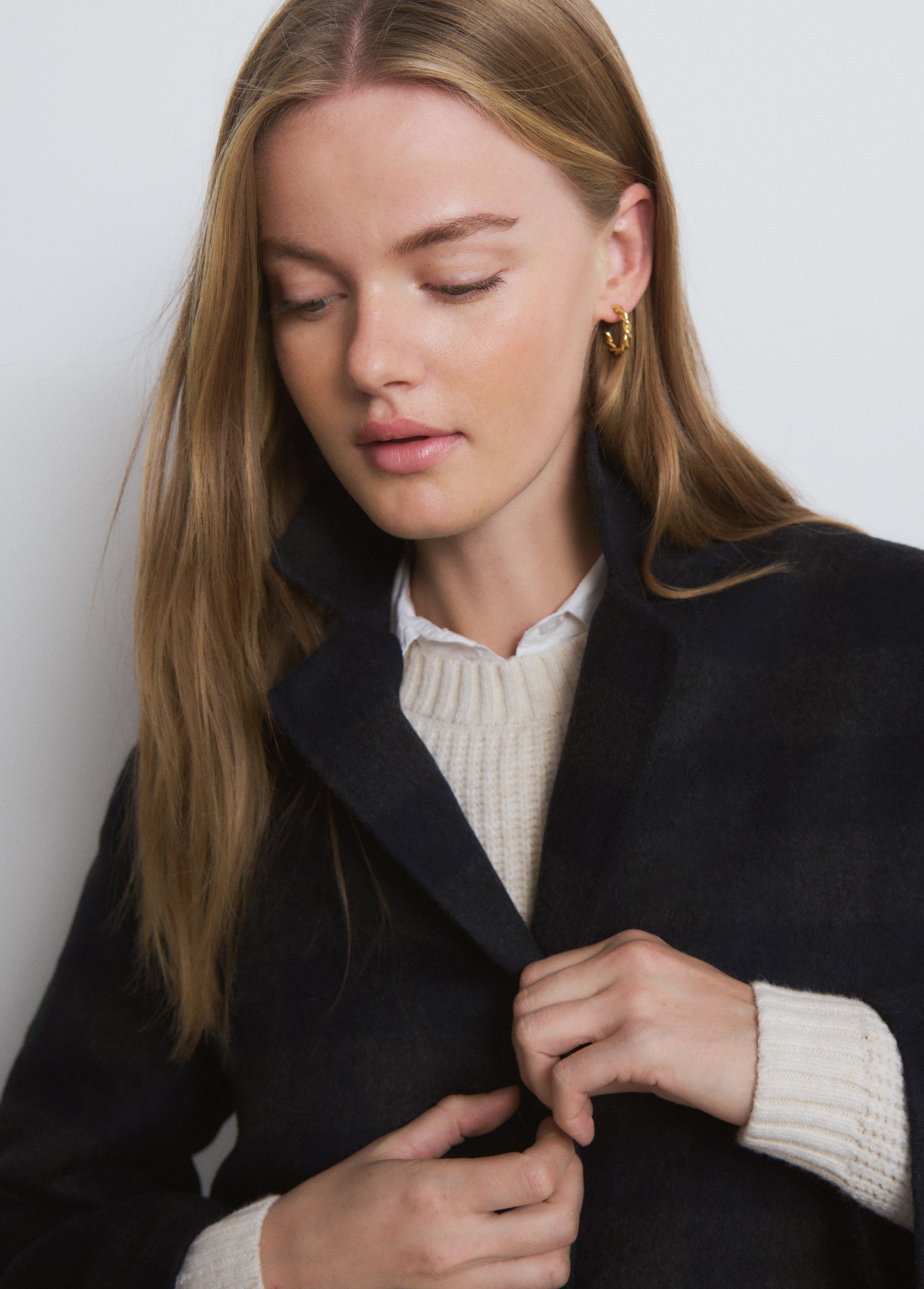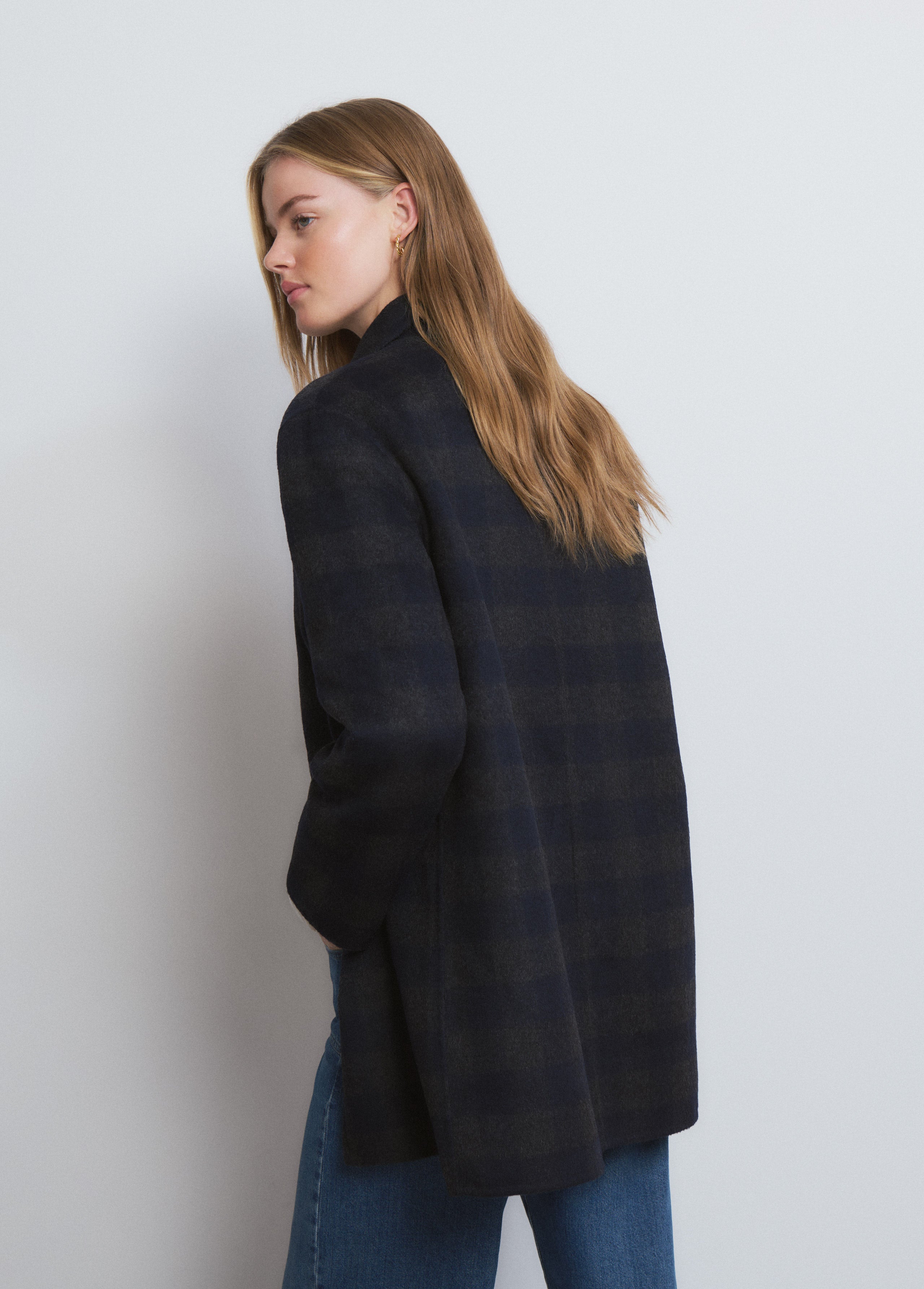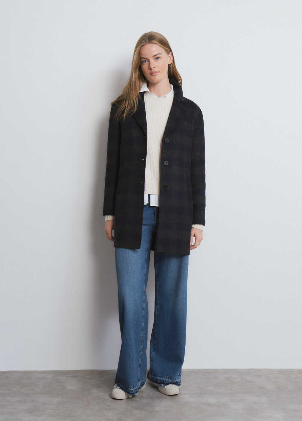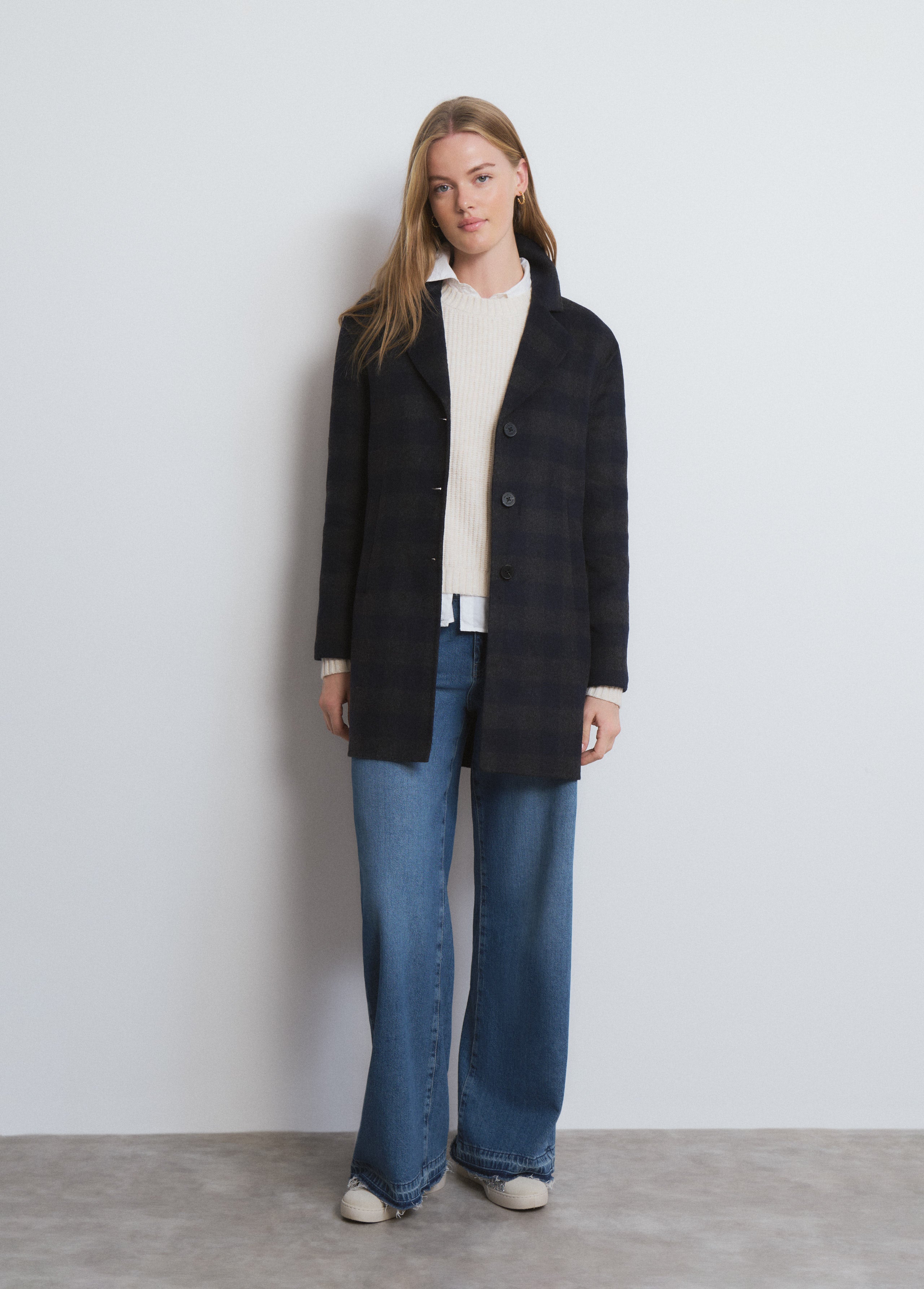 Abrigo largo de cuadros con solapa en el cuello y cierre mediante botones en la parte frontal.
