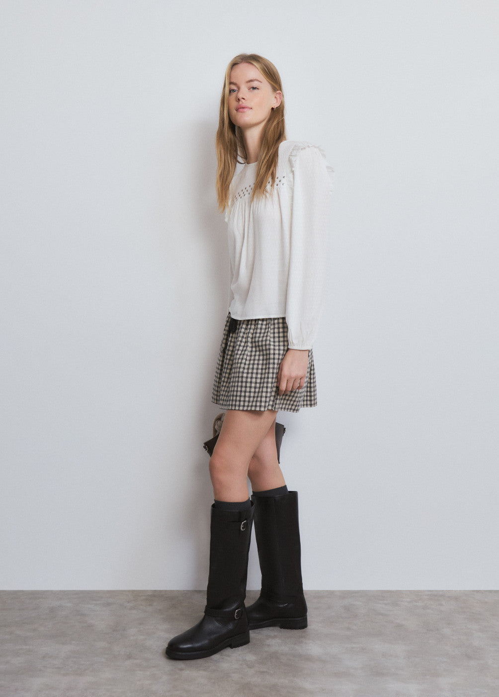 Blusa de manga larga y cuello redondo con detalle de tachas y volantes.