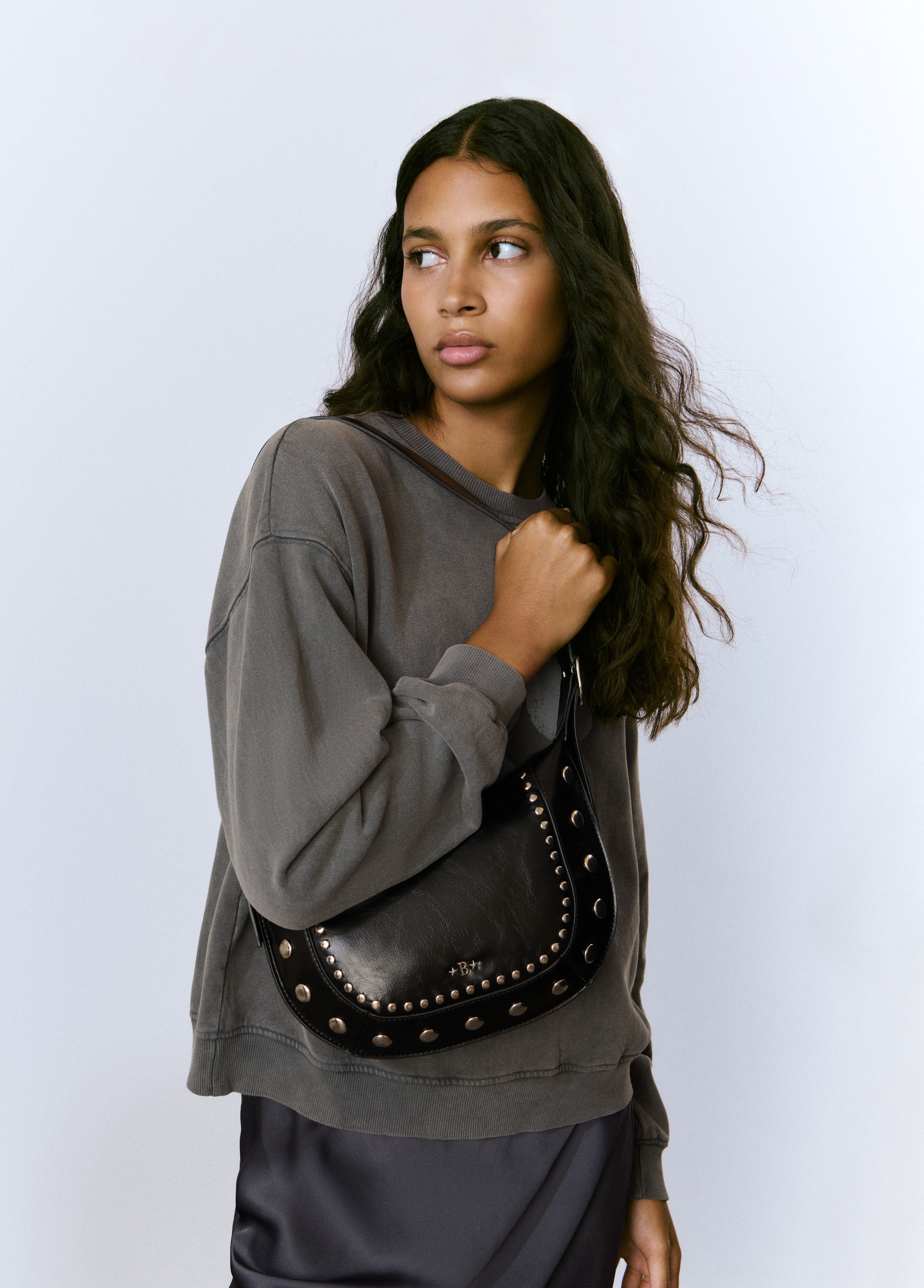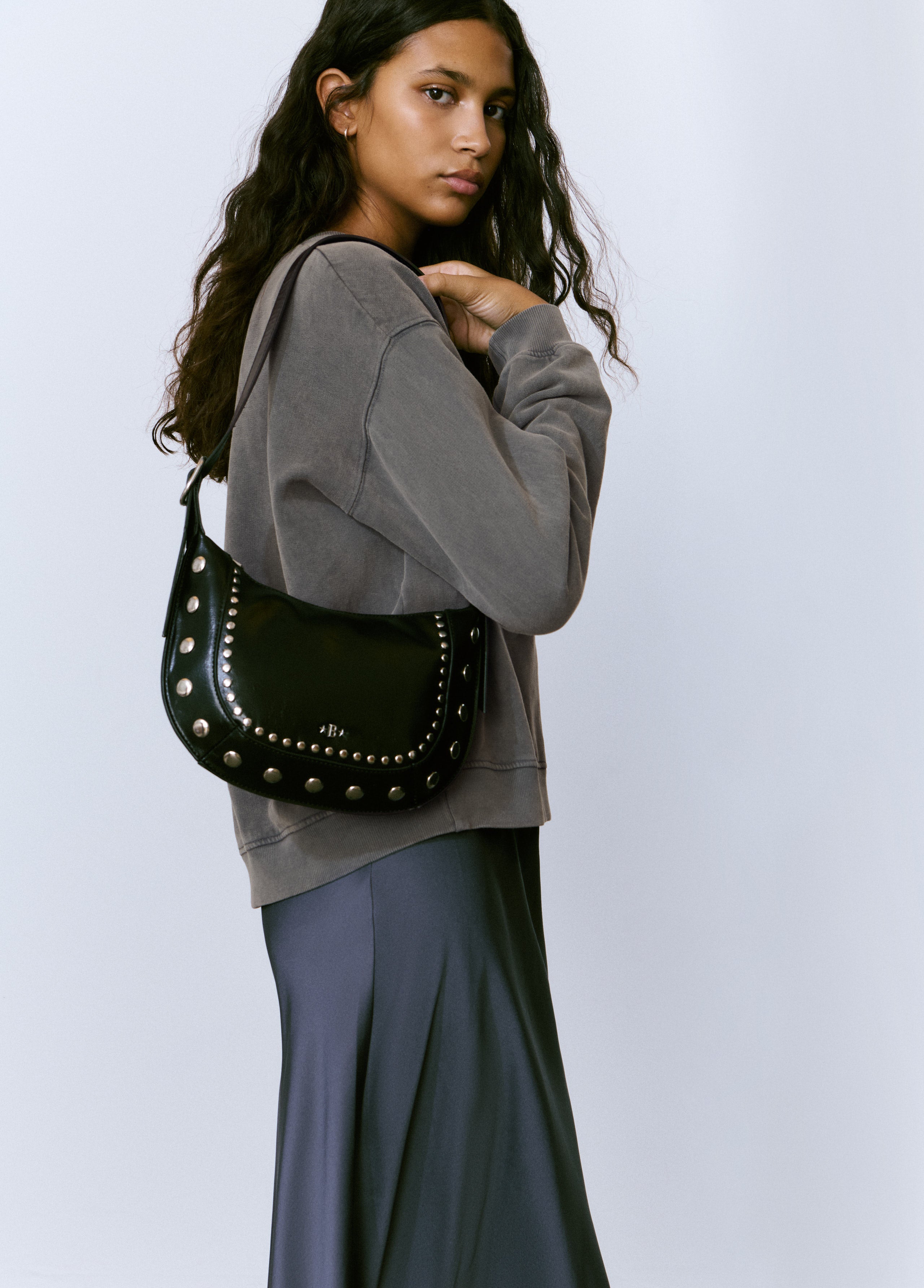 Bolso bandolera con detalle de tachas. Cierre mediante cremallera.