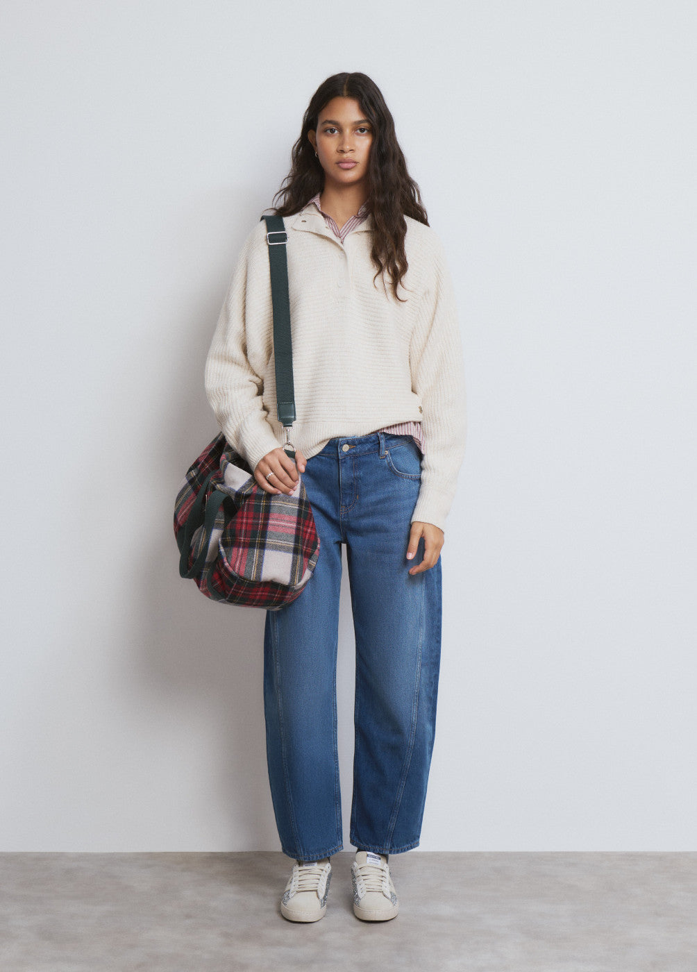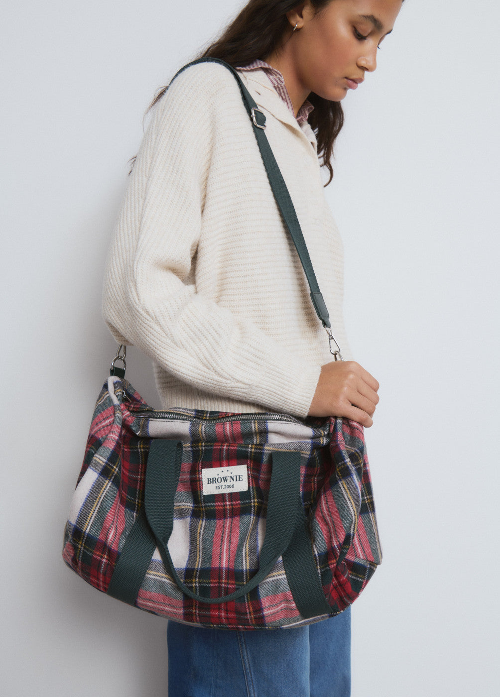 Bolsa de viaje de cuadros con asa y correa y cierre de cremallera.