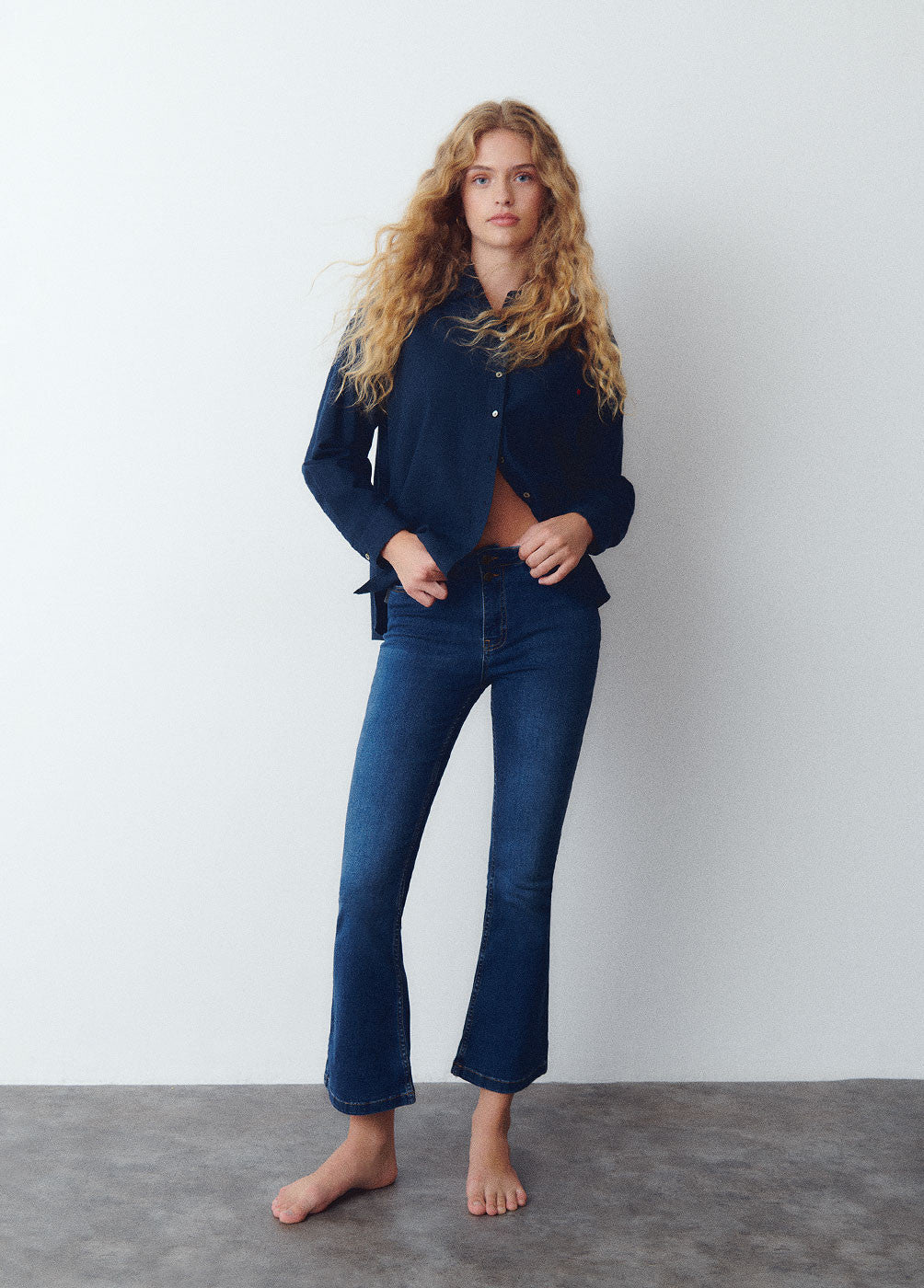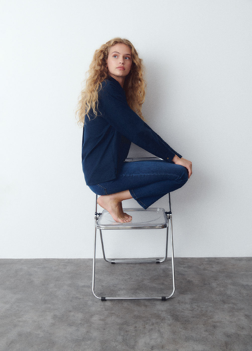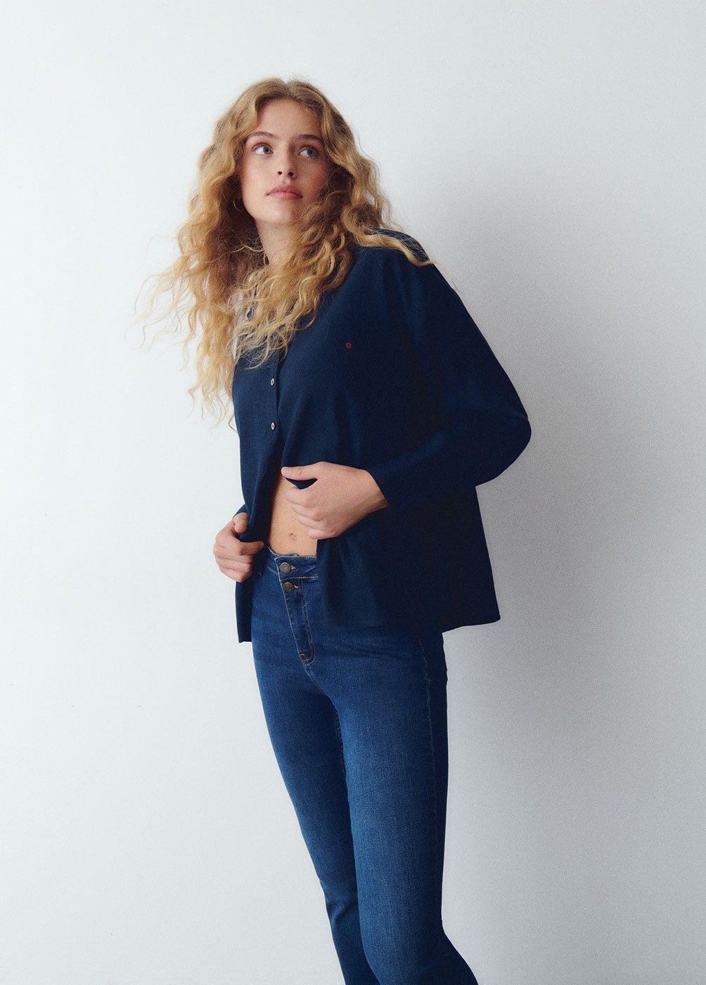 Camisa lisa de manga larga, cuello con solapas y cierre mediante botones en el frontal.