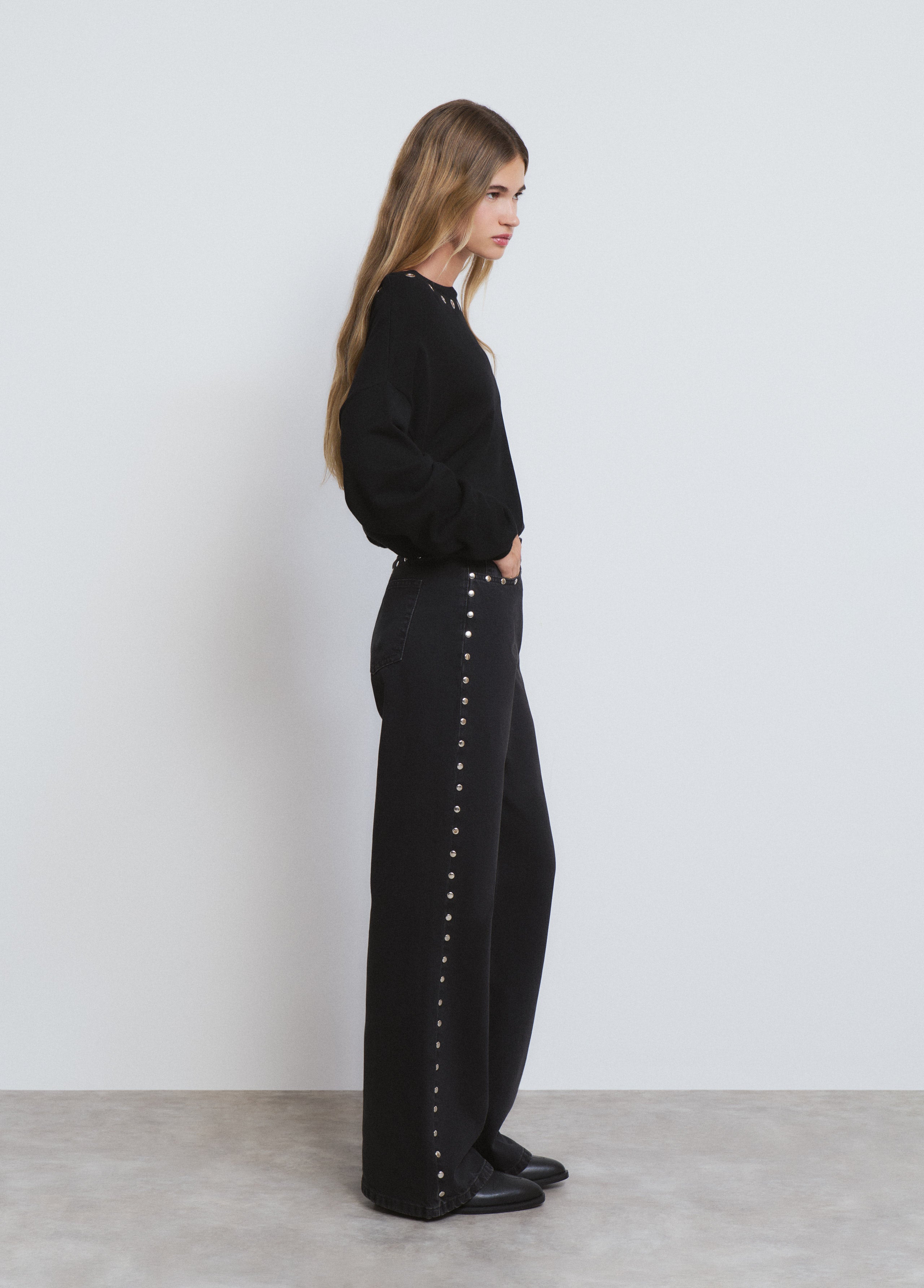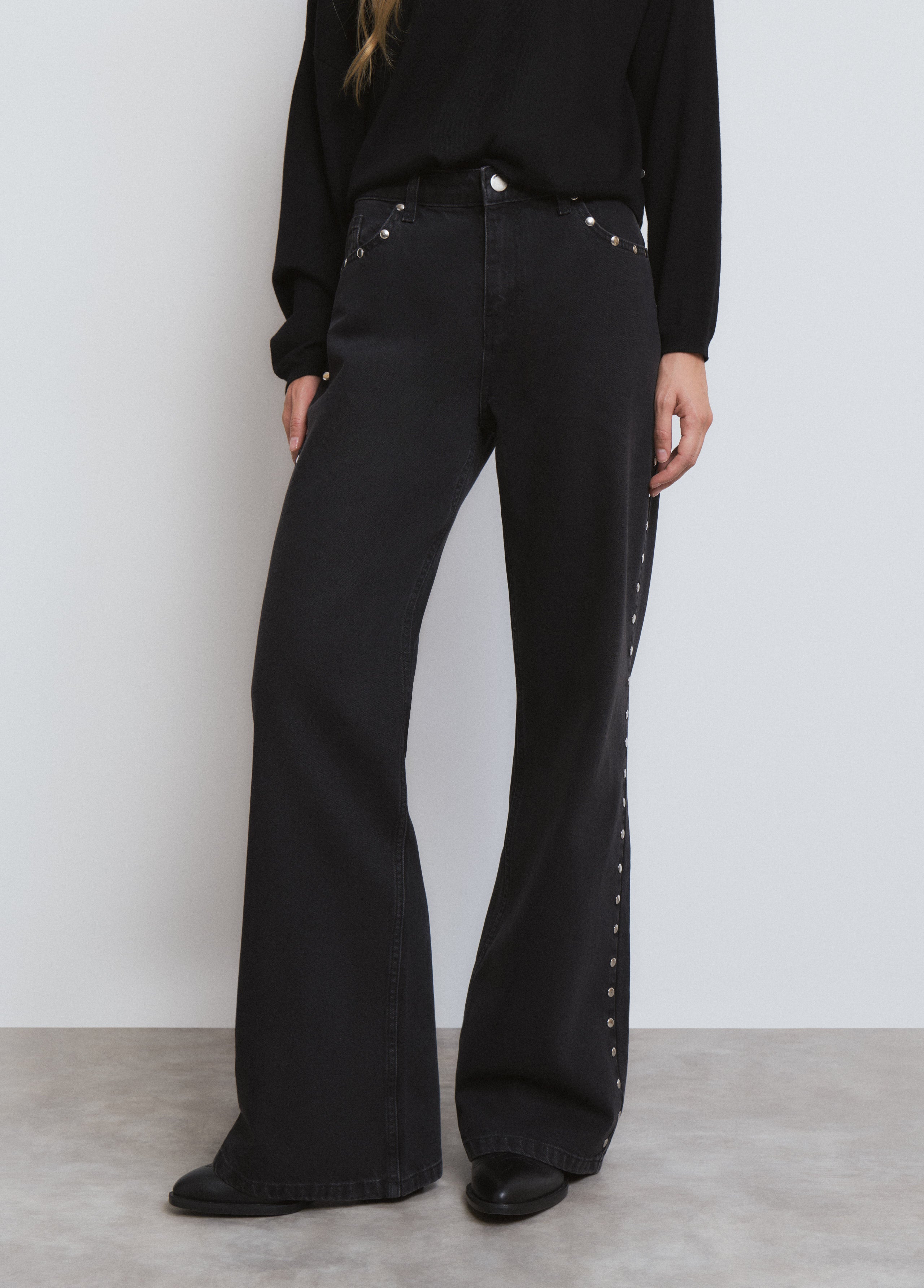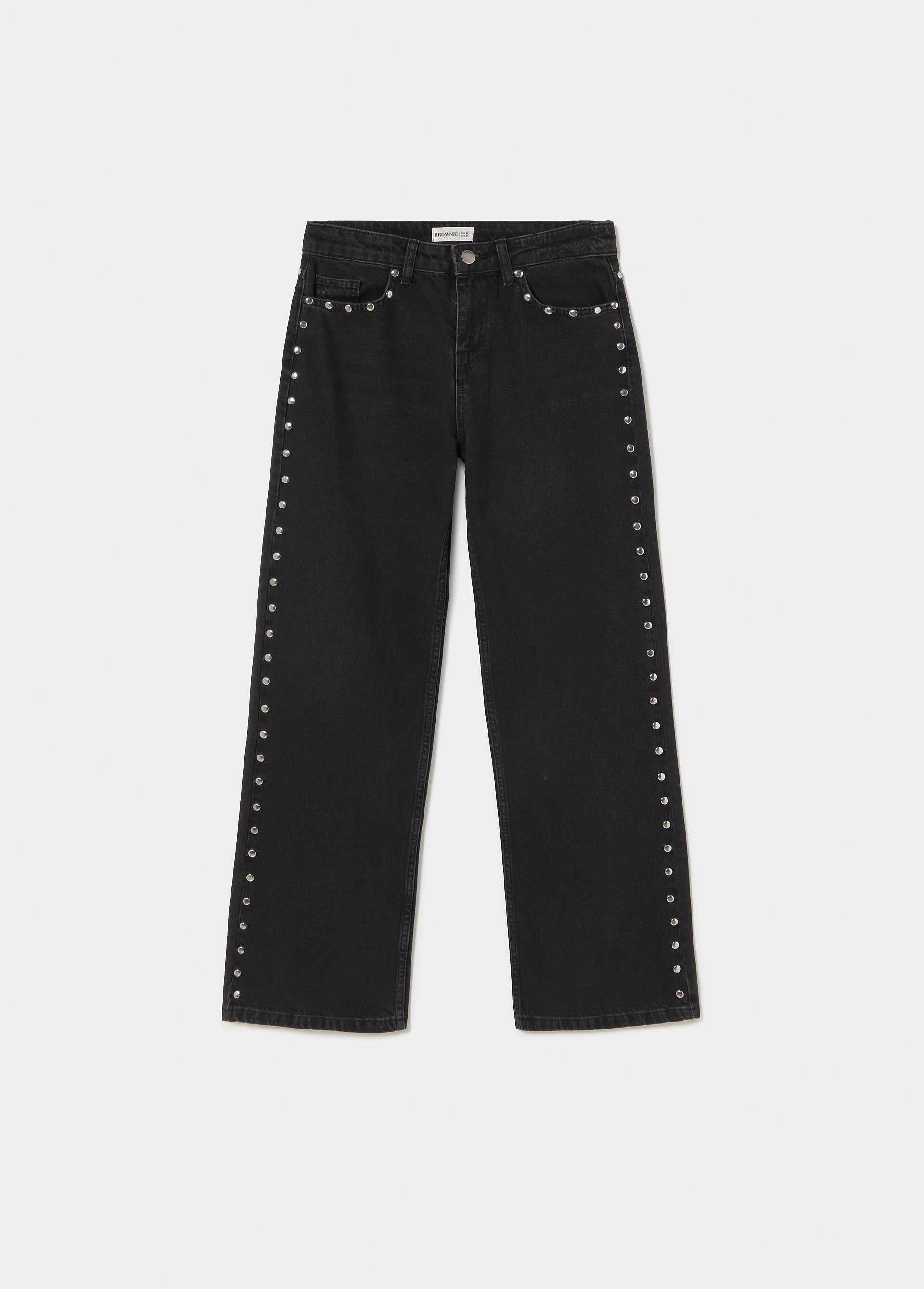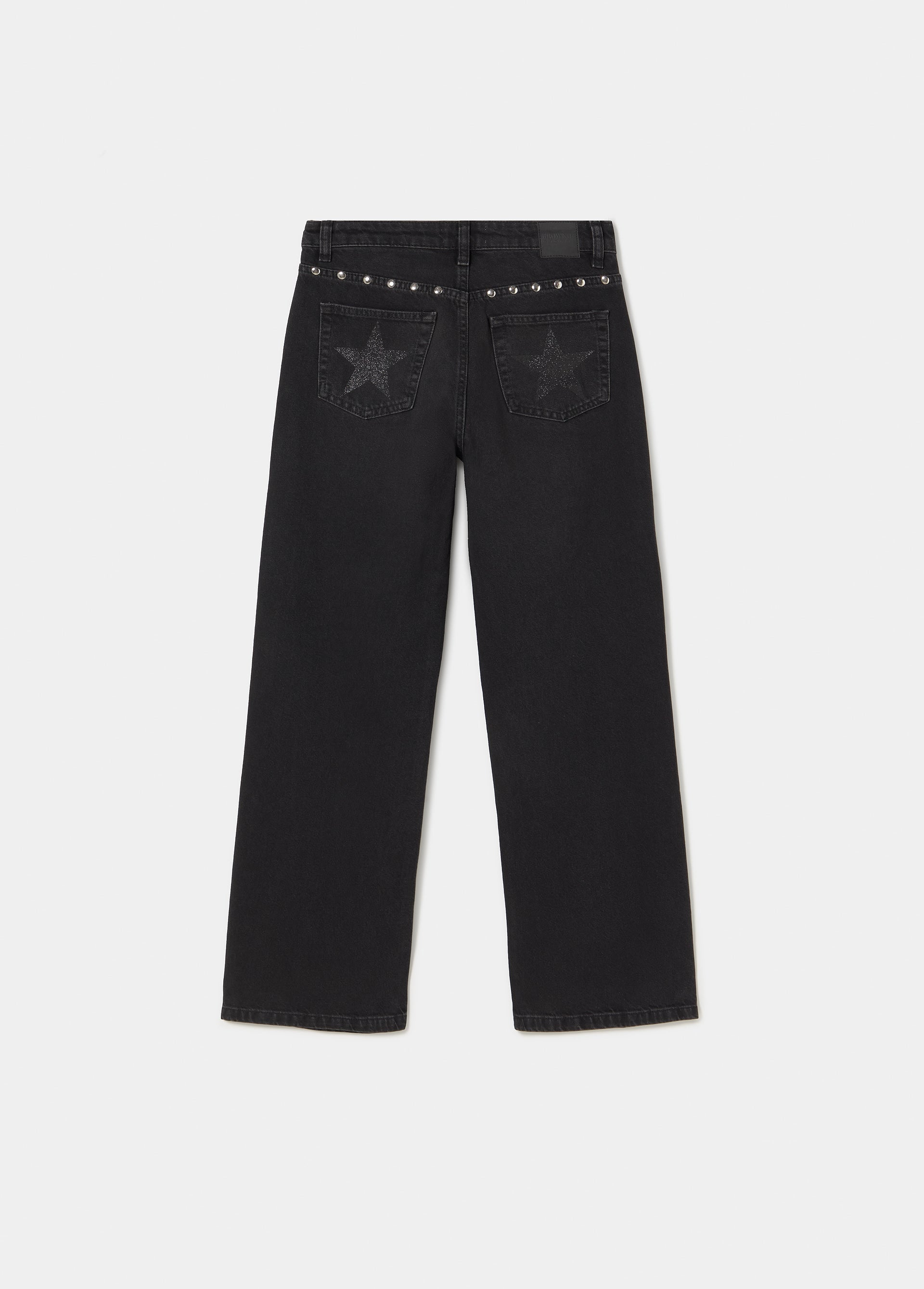 Vaqueros rectos con tachas en los bolsillos y los laterales, y estrellas en los bolsillos traseros.