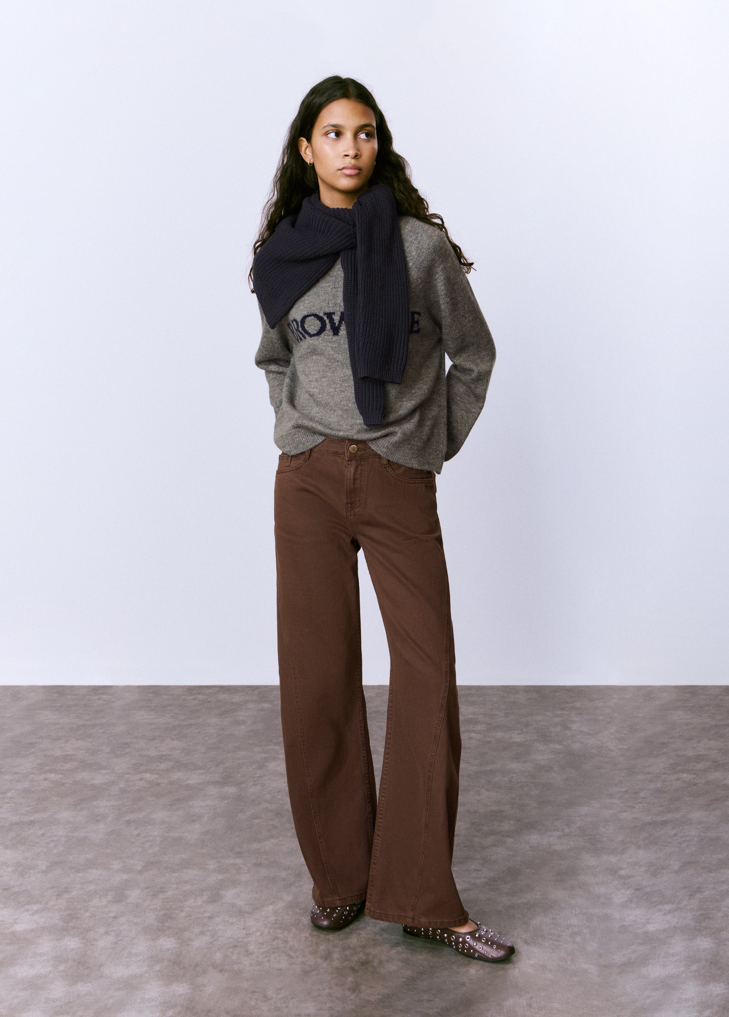 Pantalón recto con detalle de corte lateral. Cierre mediante cremallera y botón.