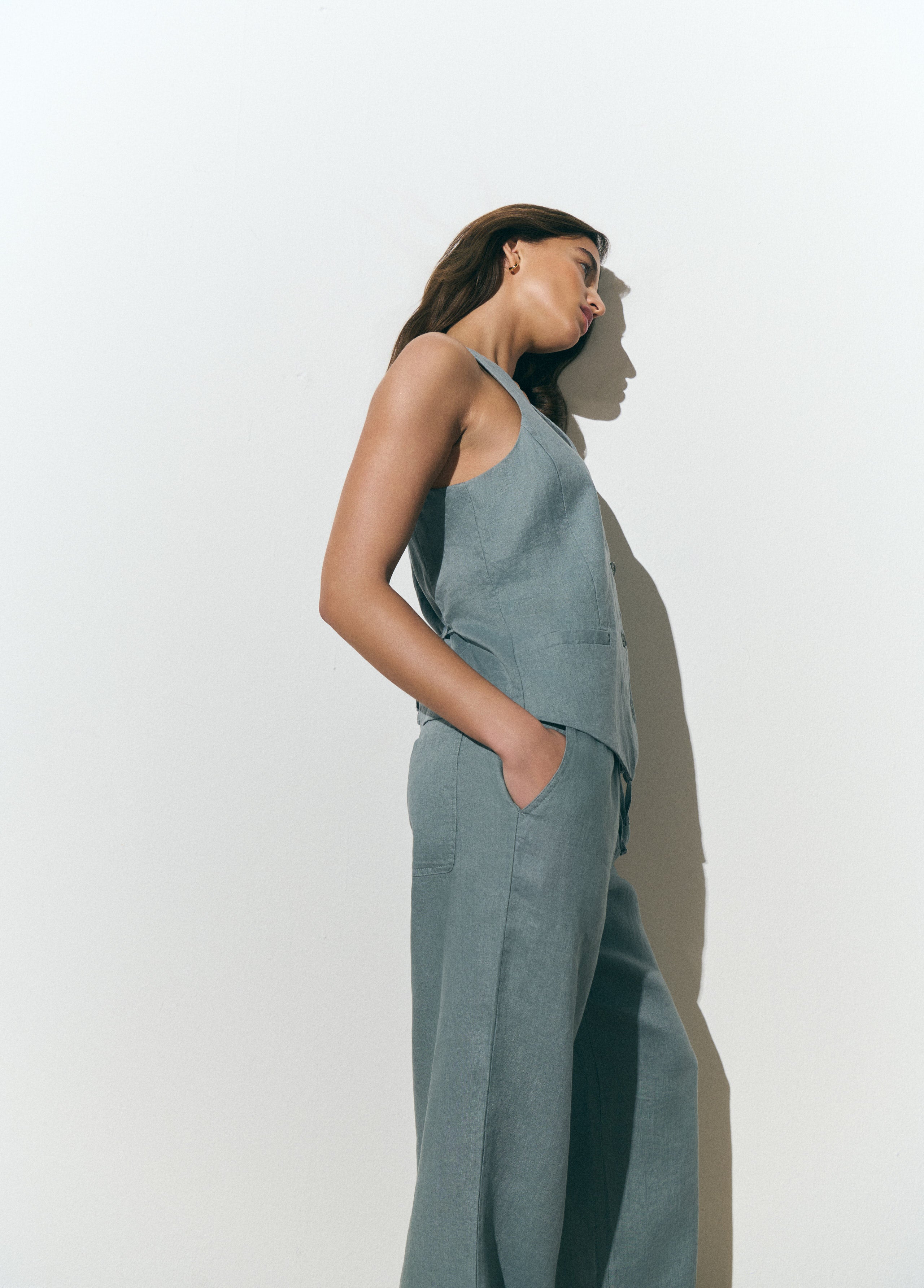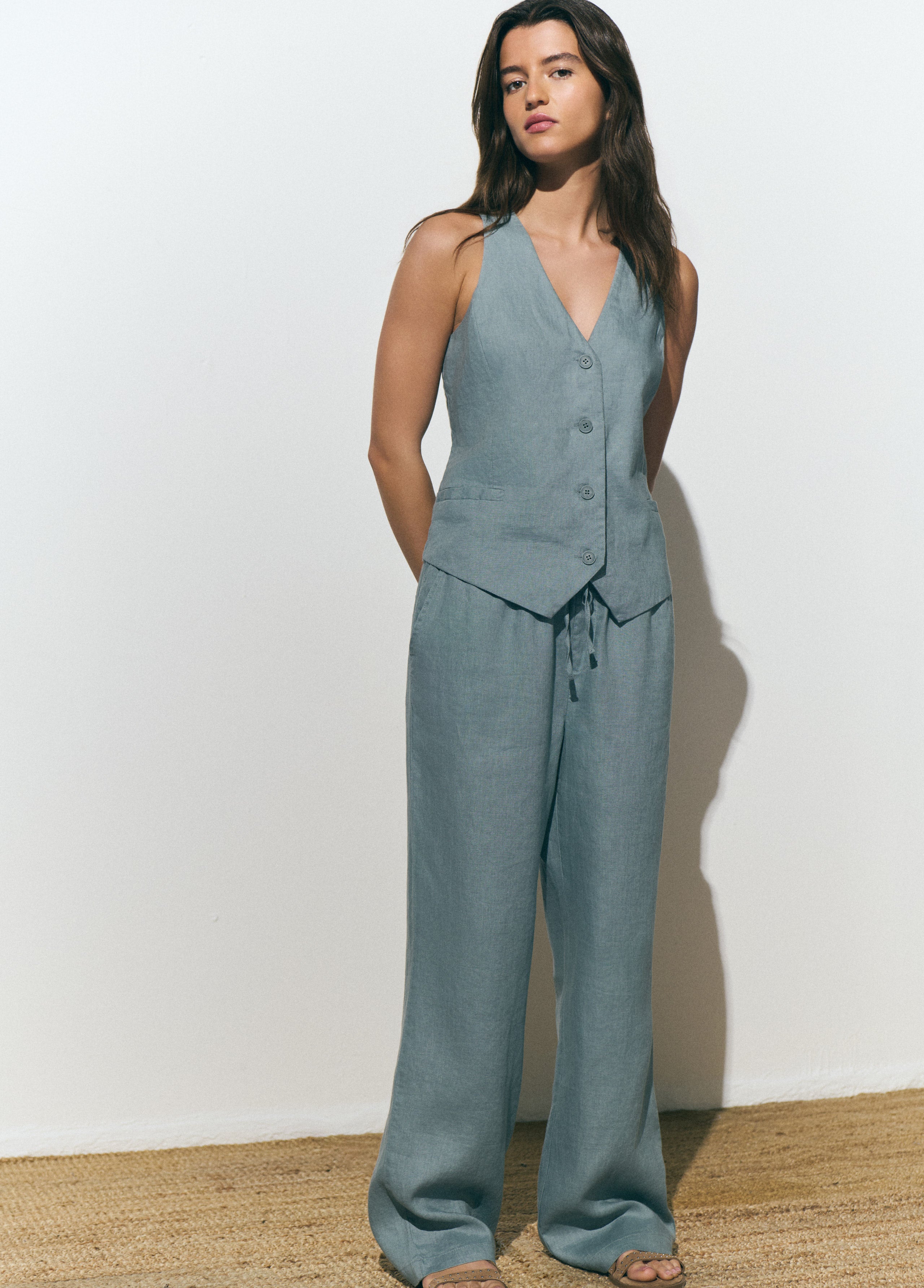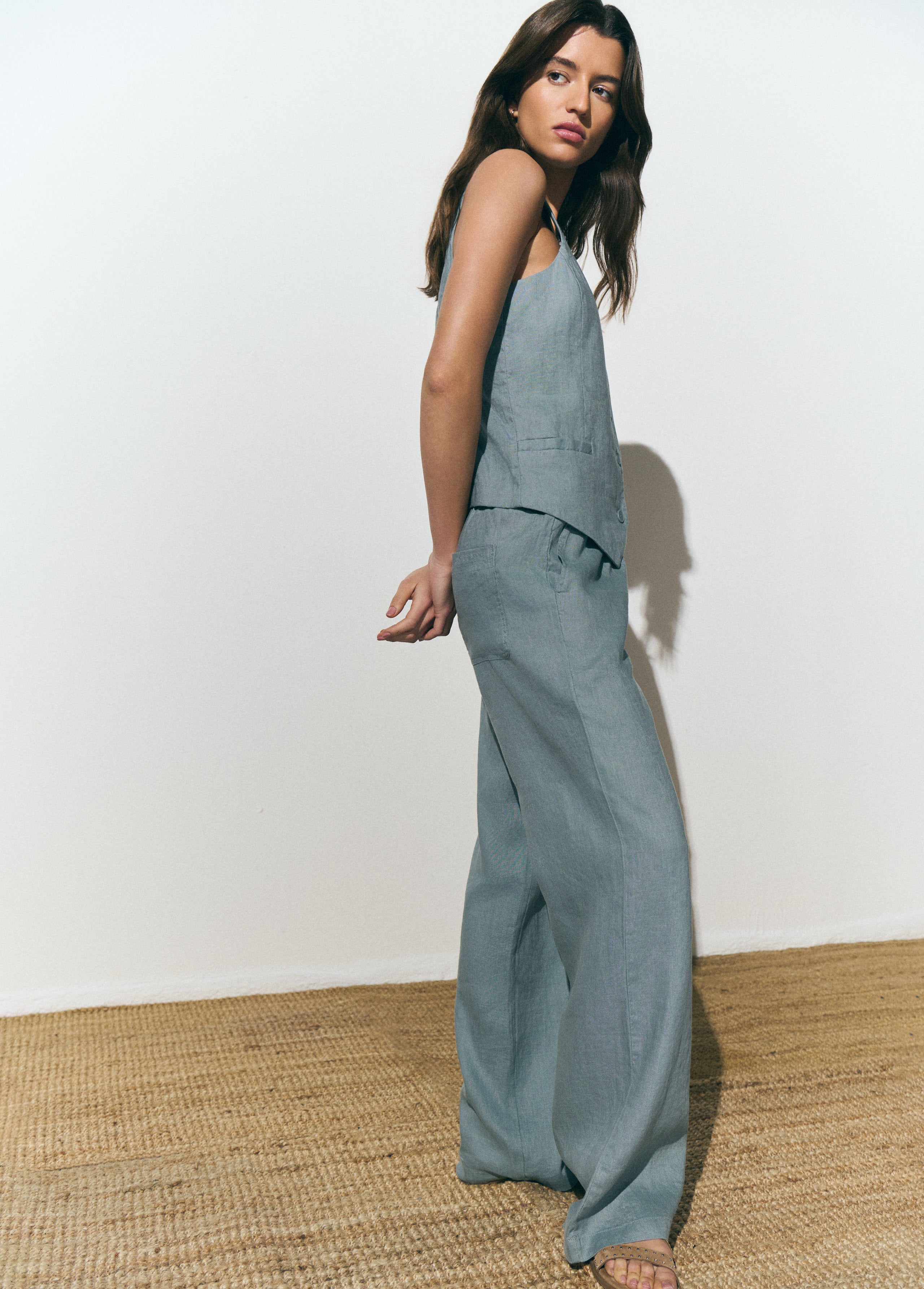 Pantalón 100% lino con detalle de goma en la cintura.