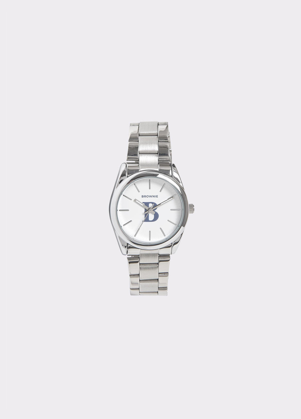 Caja: metal chapado en plateado / Esfera & Agujas: latón / Corona y brazalete: acero inoxidable