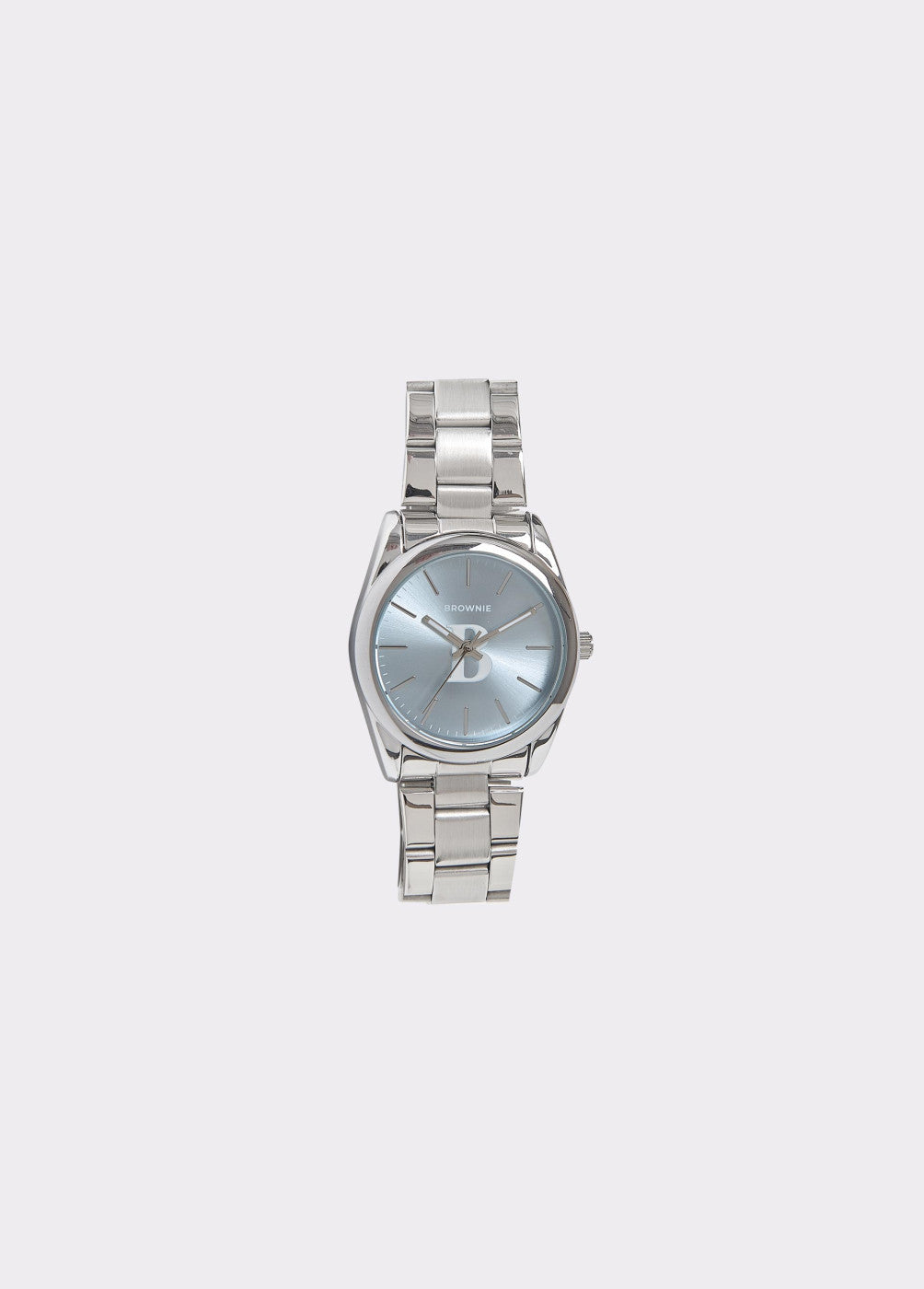 Caja: metal chapado en plateado / Esfera & Agujas: latón / Corona y brazalete: acero inoxidable
