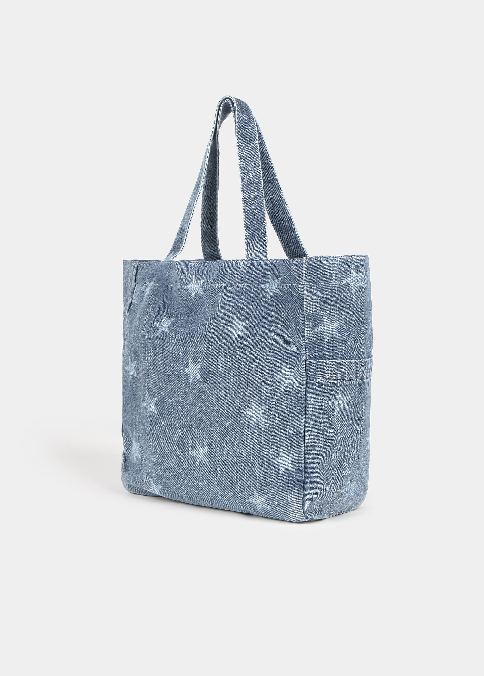 Bolso estilo shopper denim con detalle de estrellas y bolsillos en los laterales.