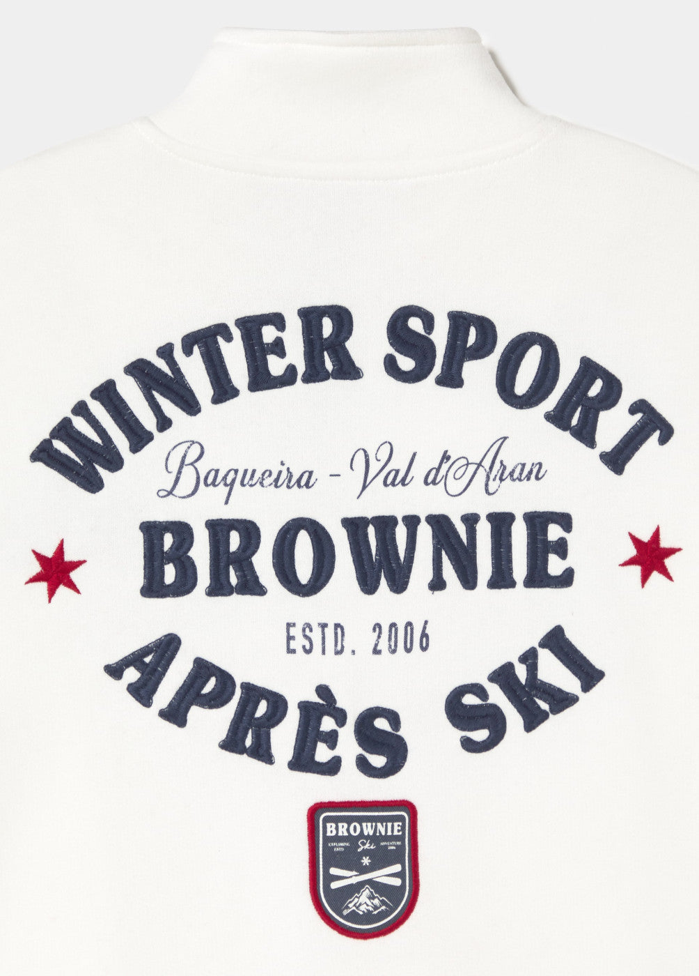 Sudadera con cremallera, logo Brownie y texto en la espalda.