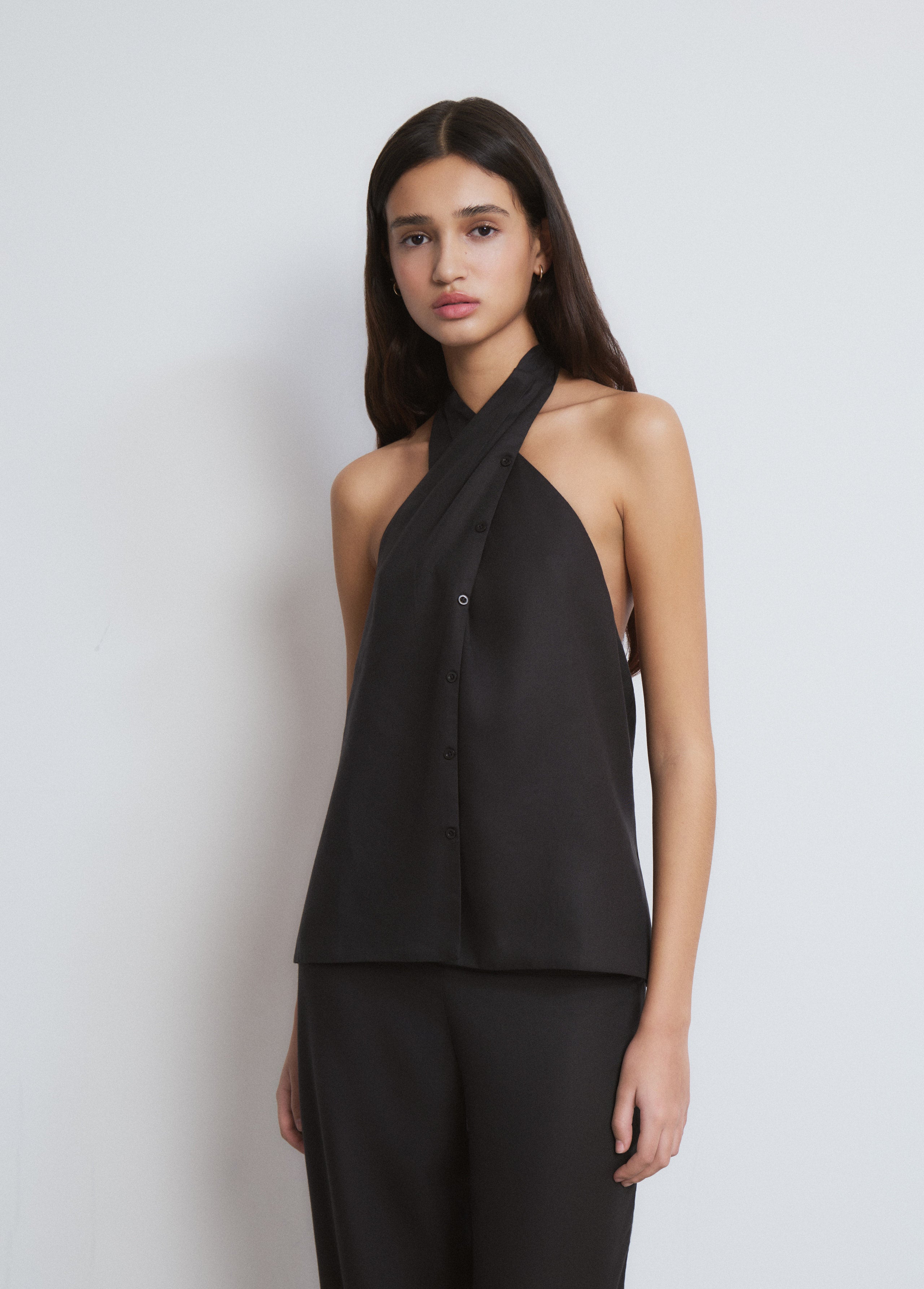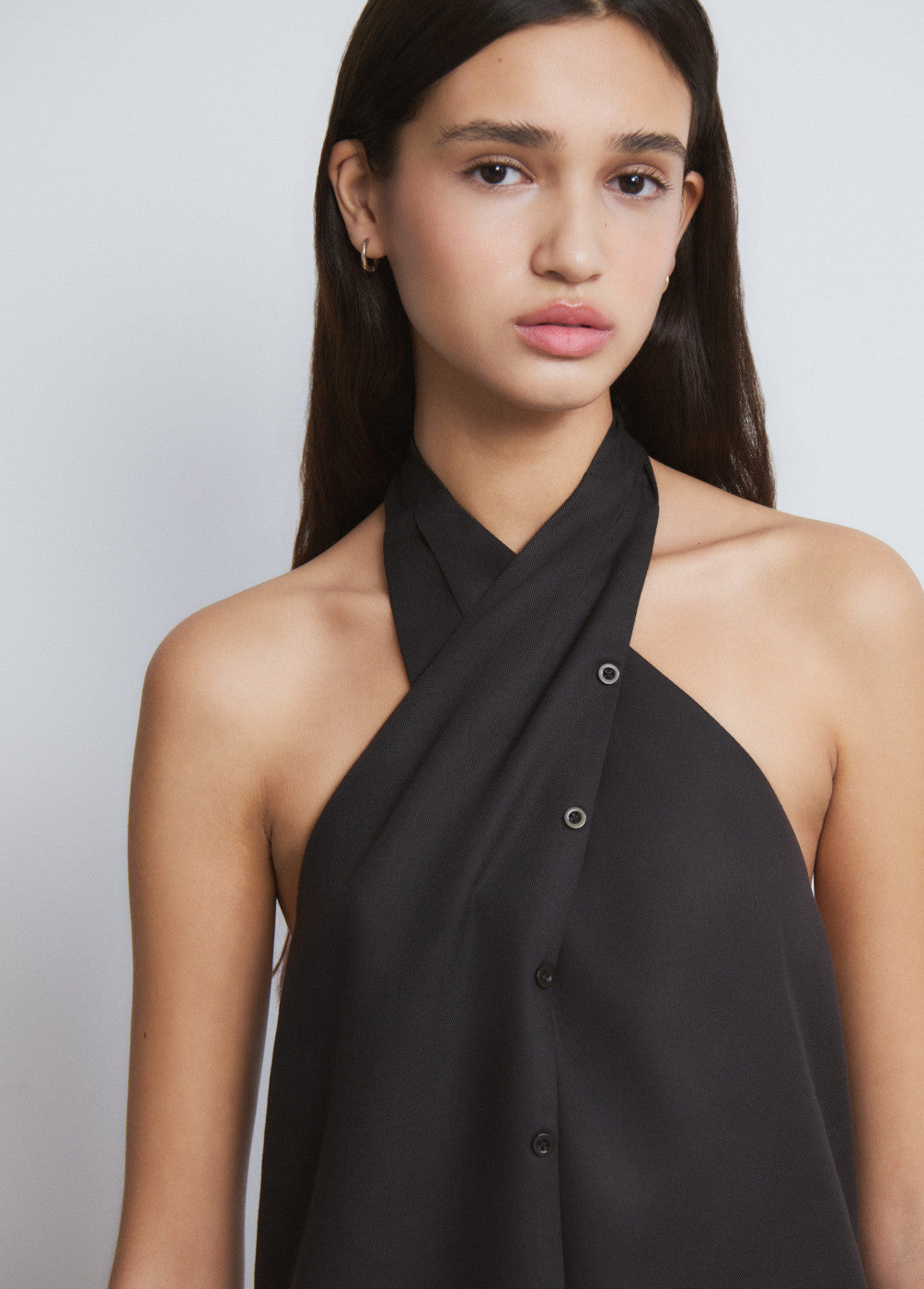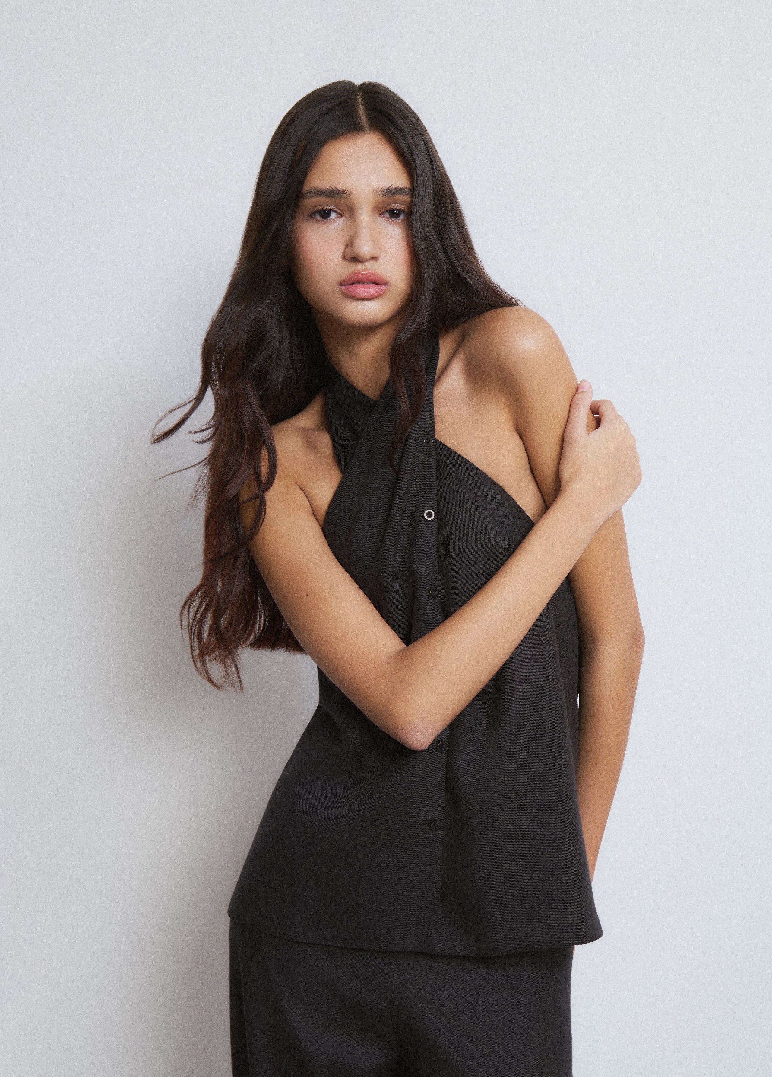 Top drapeado con botones decorativos. Solo dispone de cierre el primer botón negro.