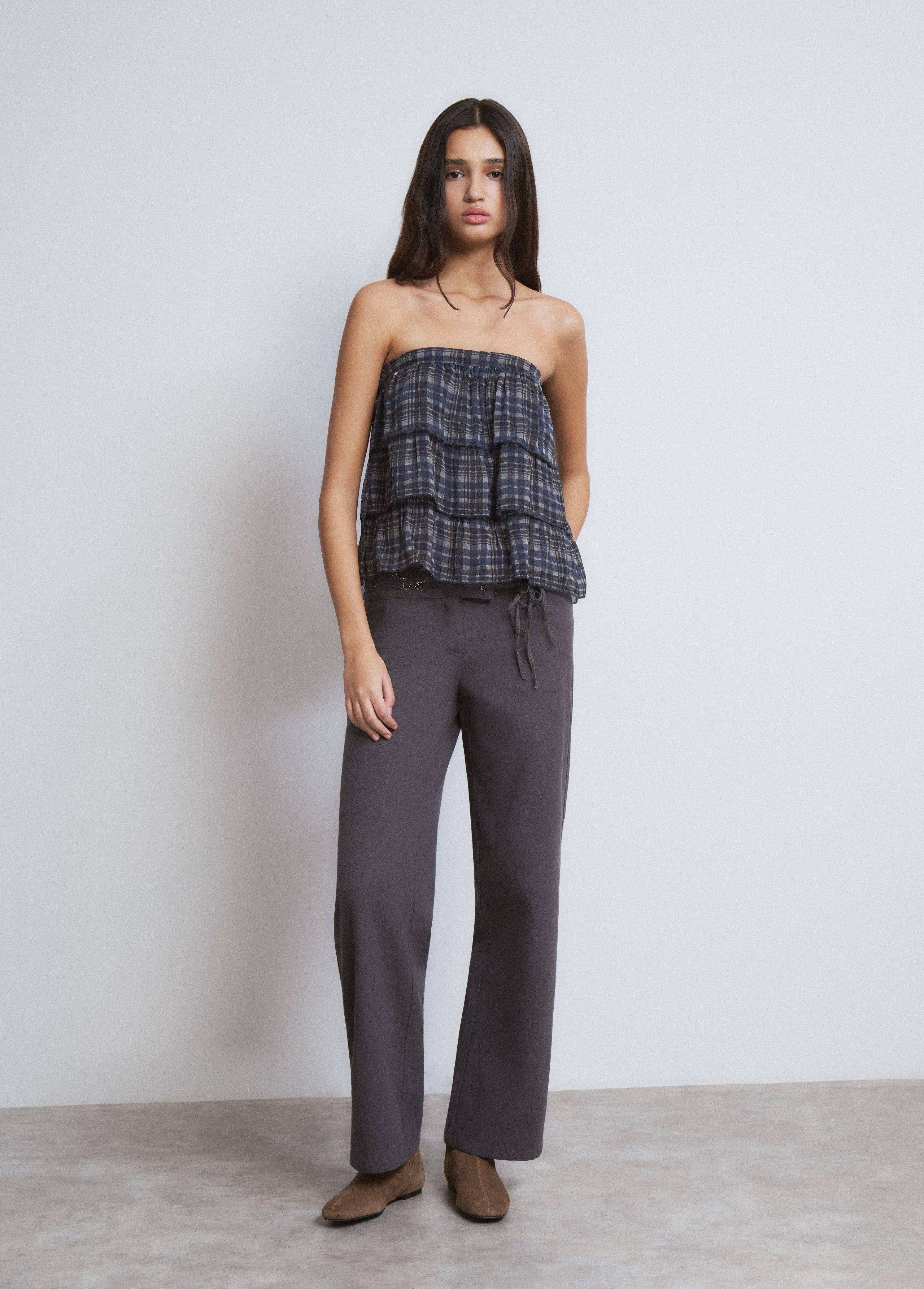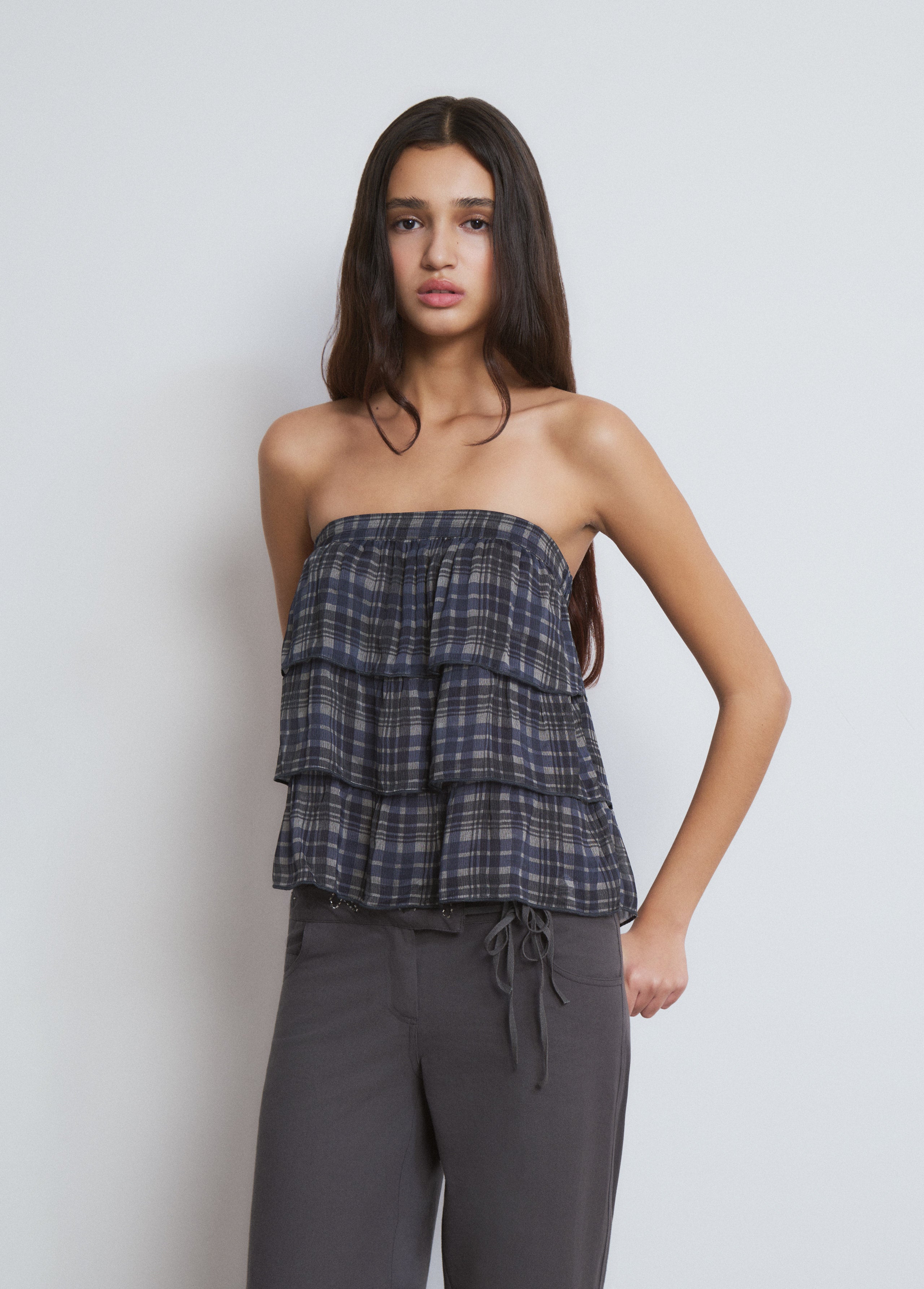 Top sin mangas con volantes y estampado de cuadritos.